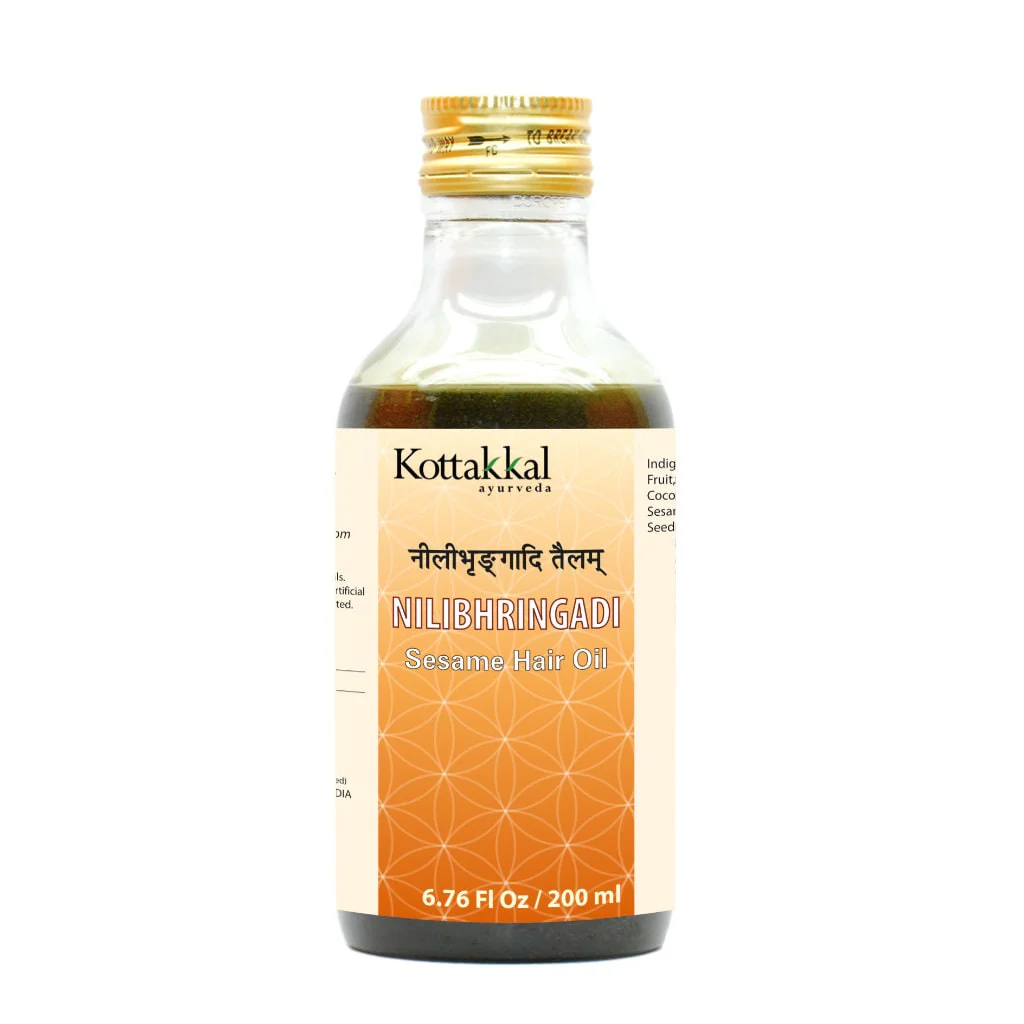 Nilibhringadi Sesame Hair Oil balances both vata and pitta dosha, the main herbs are nili and bhringaraj, supports healthy hair and scalp, reduces burning sensation, and supports sound sleep.