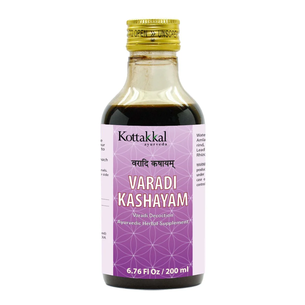 Varadi Kashayam contains the herbal formula triphala and helps to balance kapha dosha, improves agni or digestive fire, helps to lower excess meda or fat tissue and is good for balancing weight.
